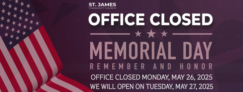 In observance of Memorial Day, the church office will be closed on Monday, May 26, 2025. We will reopen on Tuesday, May 27, 2025.